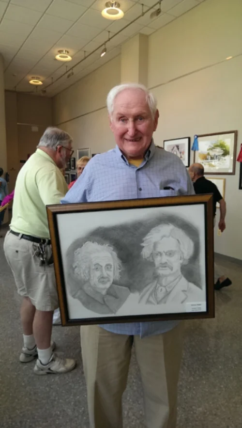 This morning I attended the reception for Middlesex County's Senior Citizen Art Contest. I was asked to serve on a 3 person panel of judges and today we gathered to celebrate the artists who created the work. The contest was open to any resident of Middlesex County who is over age 60 and there were categories for professional and non-professional for many different media. As I was walking back into the gallery after the awards, I was stopped by the wife of one of the artists who had some questions. She said her husband had just started drawing and only began his submission 3 weeks before the contest. She seemed a little disappointed that he hadn't won an award and was looking for some tips for next year's show; she wanted to know if it might be easier to win an award in a category with fewer entrants. However, when he told me about his piece, his eyes sparkled and he said, "I love to draw!" I told him that if he loved it, he should just keep drawing-- after all, this was his first time! I asked him if I could take his picture and, as you can see, he beamed with pride just to have been in the show. Isn't that really what it's all about? You do what you love, you get enjoyment from the process, and you keep doing it.