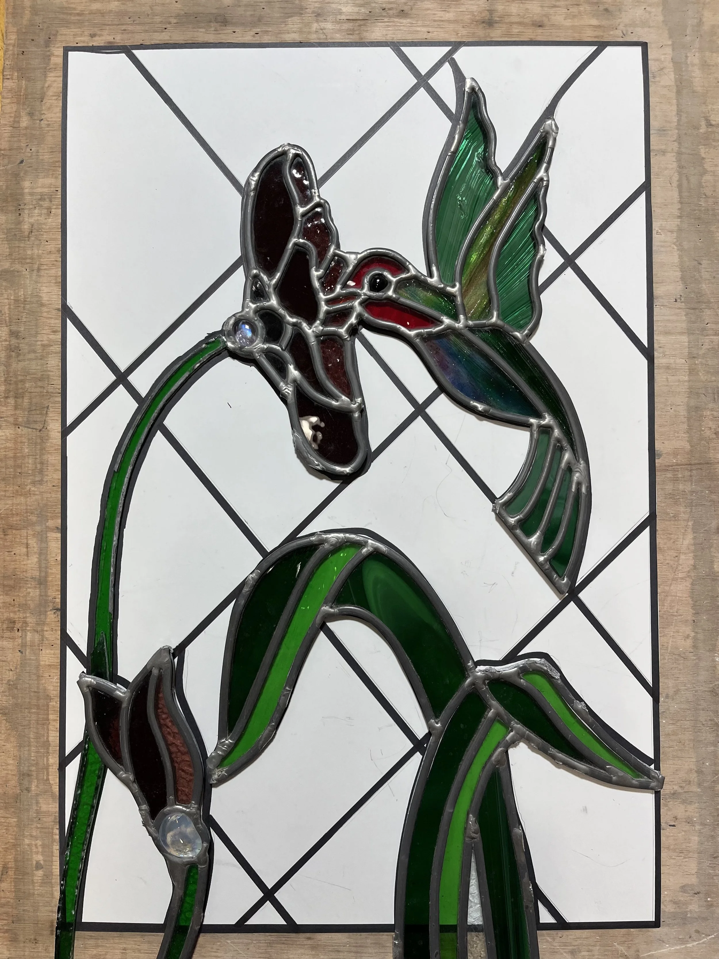 When she brought it to me, it was in rough shape. I couldn’t even see all the beautiful colors in the hummingbird until I took it apart and cleaned everything. Before I could even start designing the new panel, I had to carefully free the original elements and start rearranging them into a new design.