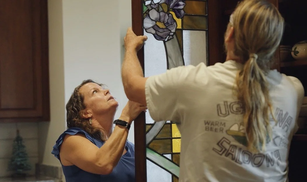 This cycle repeated itself seven times last week when we installed the stained glass pieces I’d been working on for my client in Lenoir. For smaller installations, I usually work with my husband, but because of the scope of this project, I chose to bring in a professional installer. My husband was quite happy to sit this one out. As with most handmade artwork, there was some shimming and trimming required to get everything to fit perfectly, but it all went smoothly—and best of all, my client was thrilled.