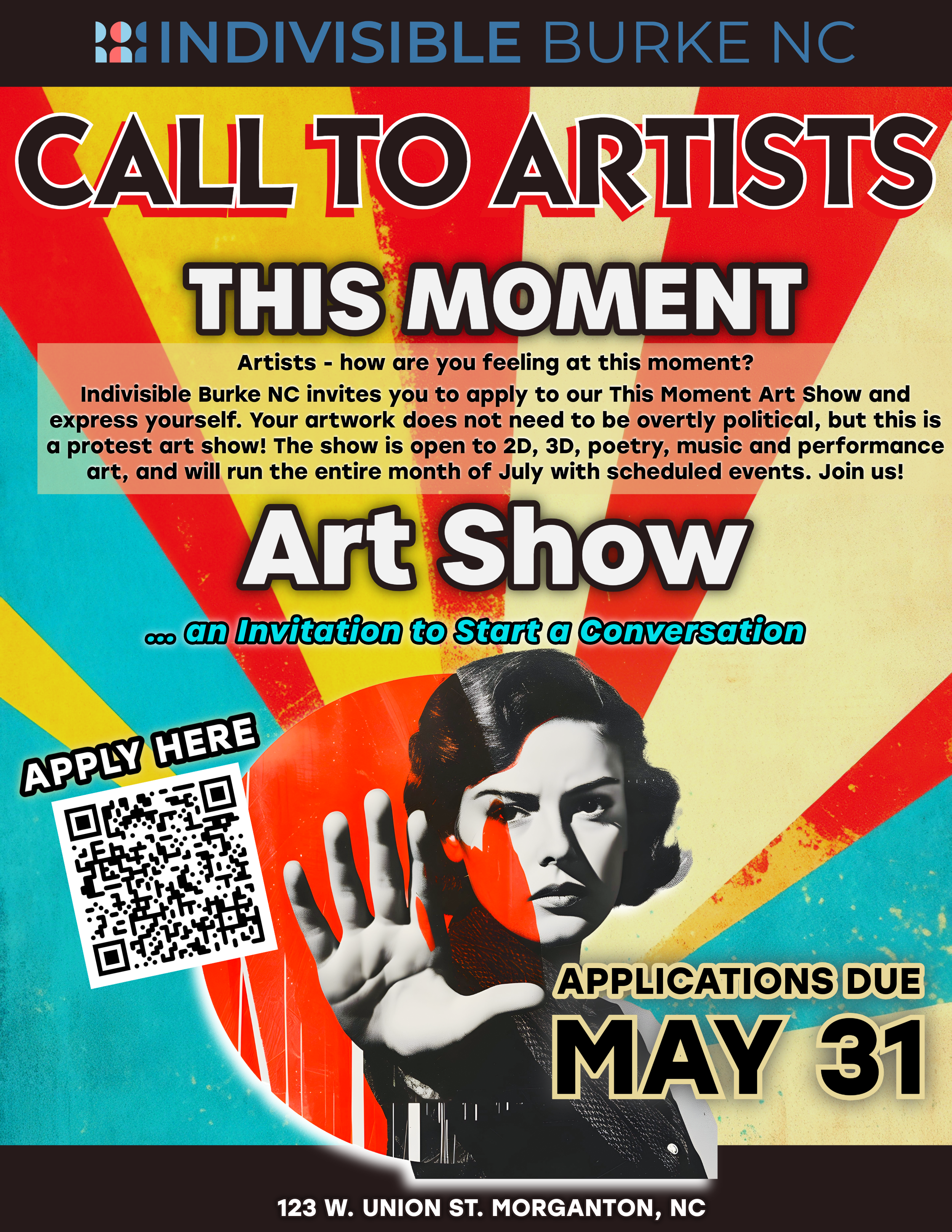 Indivisible Burke NC — a nonpartisan, nonviolent, grassroots organization committed to real democracy, of, by, and for all people — a group that I've been involved with since its inception just over a year ago, is sponsoring the show. We've planned a full month of art and community events in the heart of downtown Morganton. We put out our Call to Artists and we're genuinely curious to see where this leads.